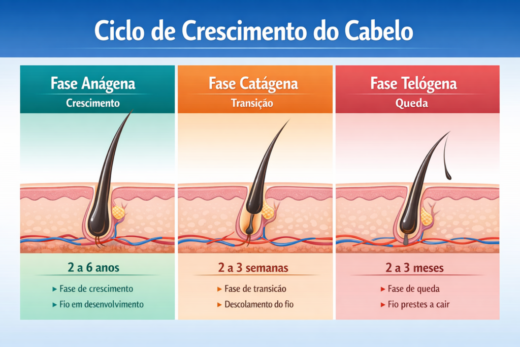 Para compreender o shedding, é essencial entender o ciclo capilar, que ocorre continuamente ao longo da vida e é dividido em três fases principais: